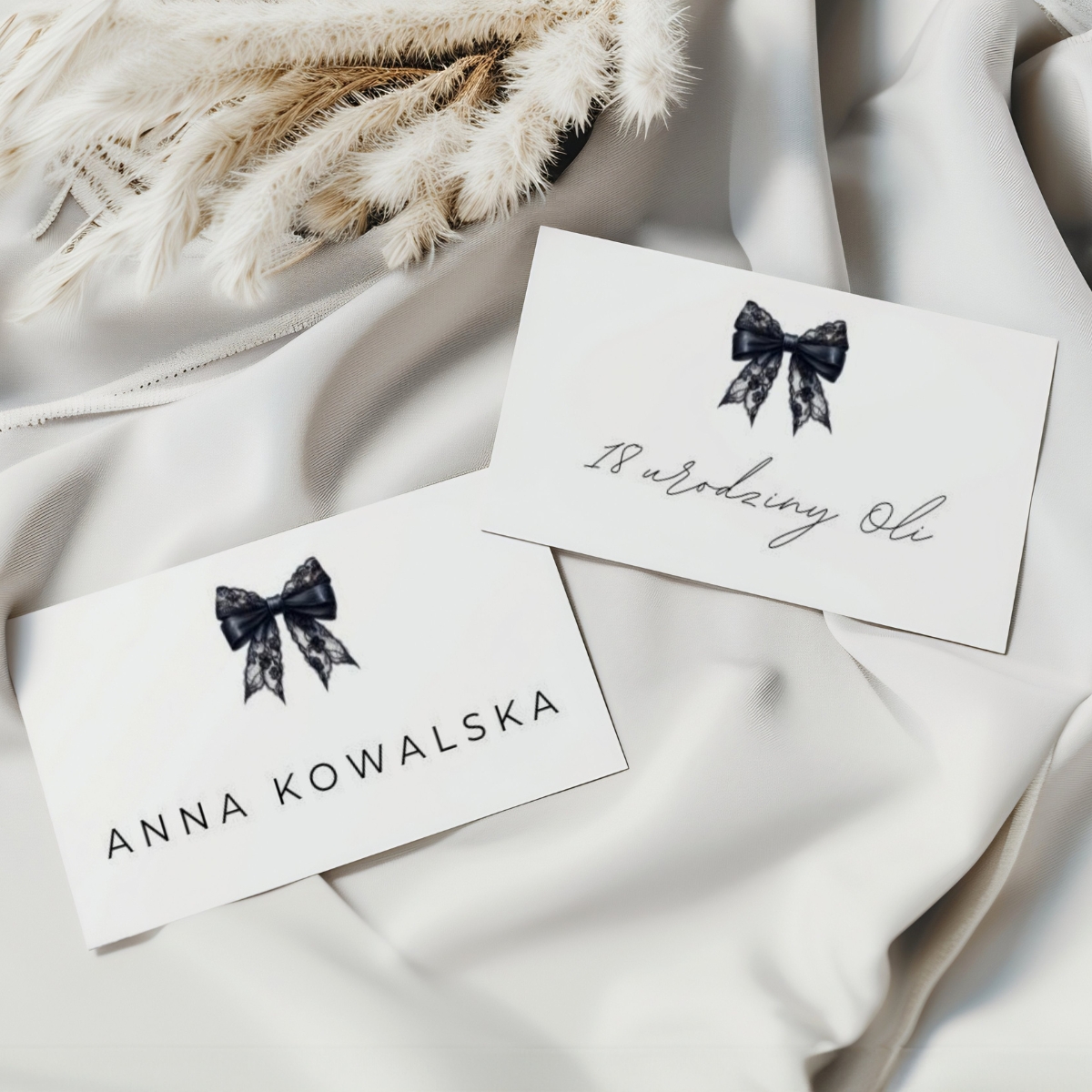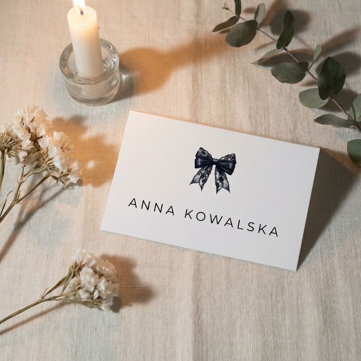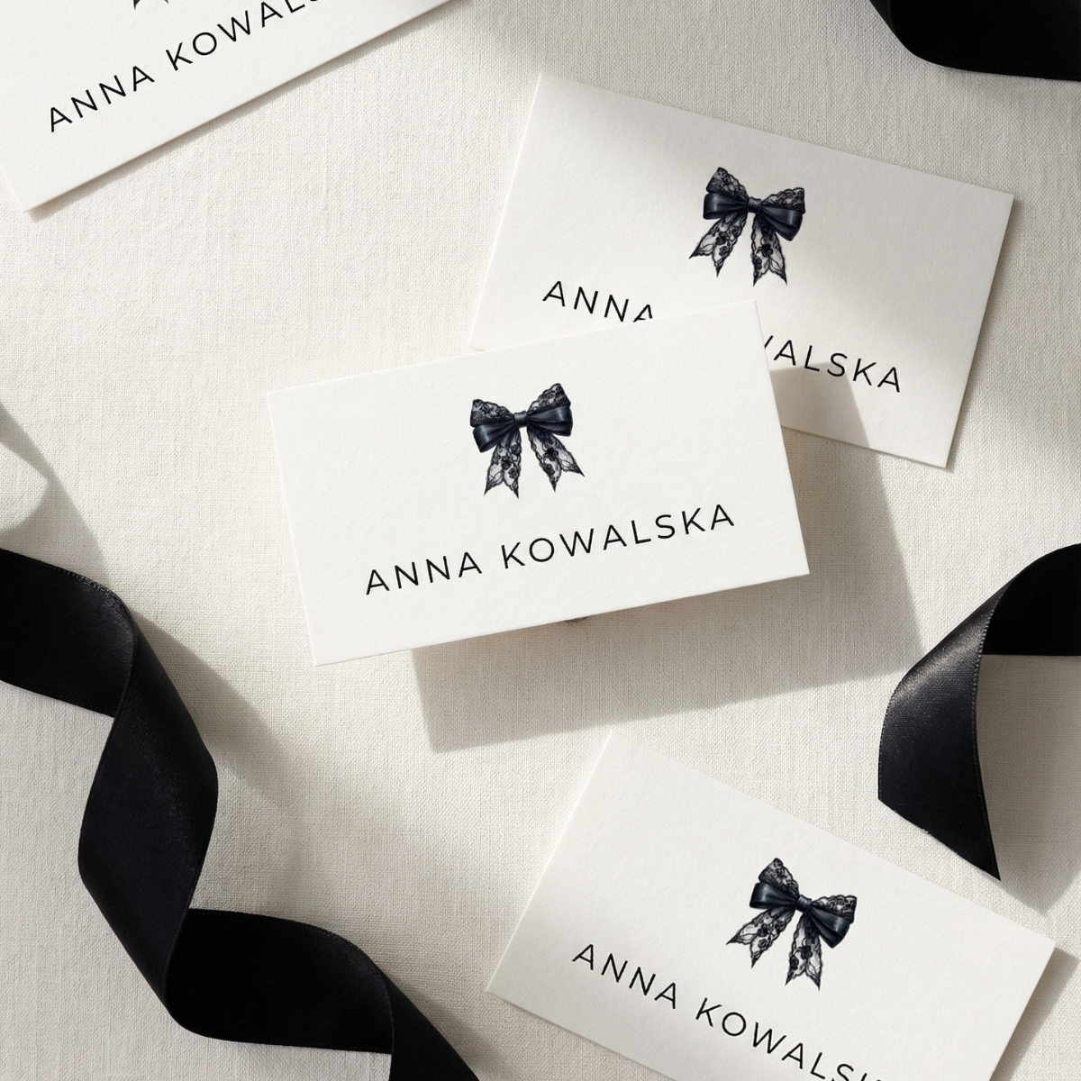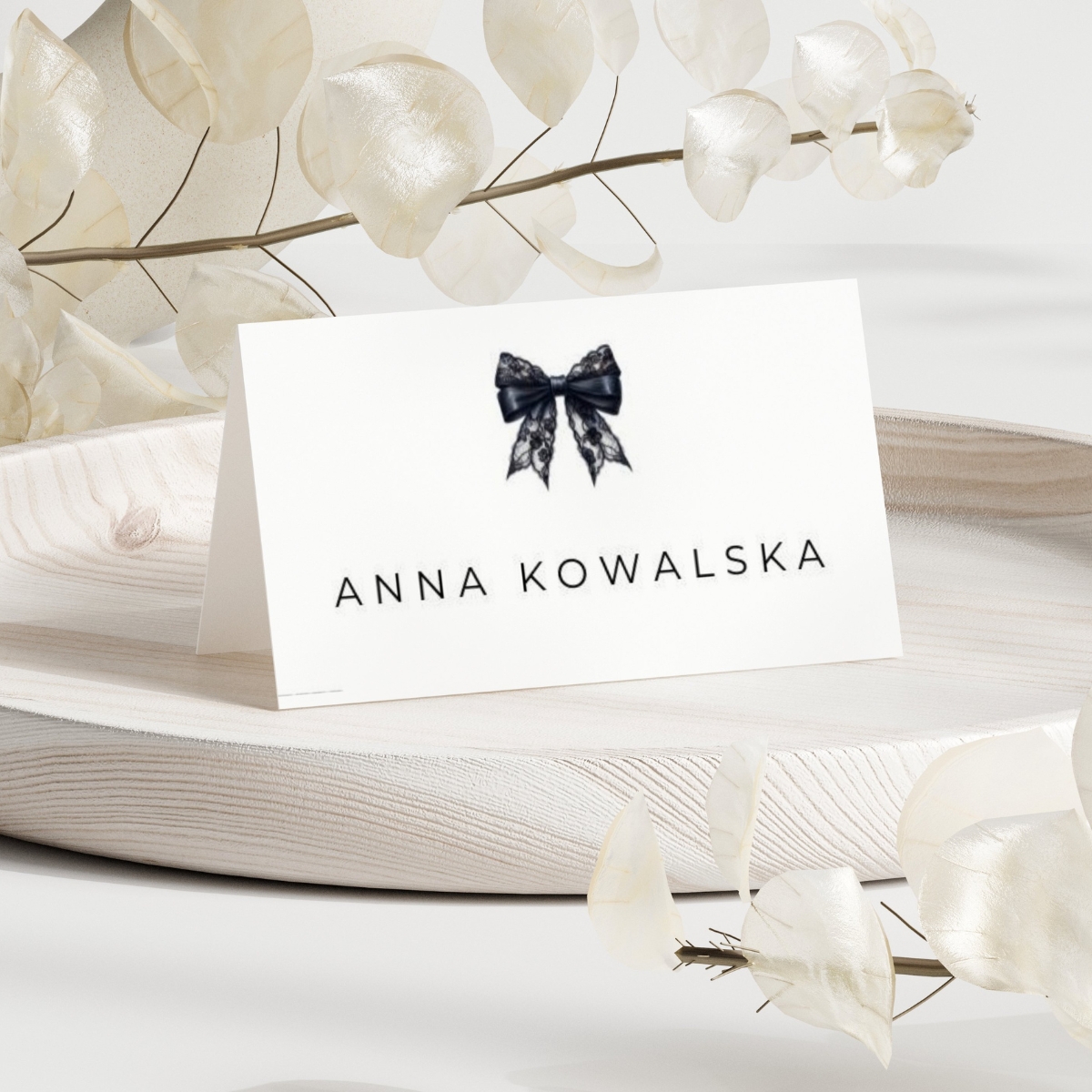 Subtelna typografia, czysta biel i ilustracja czarnej koronkowej kokardy tworzą ponadczasowy, luksusowy design, który pasuje zarówno do nowoczesnych wnętrz, jak i eleganckich aranżacji stołu.