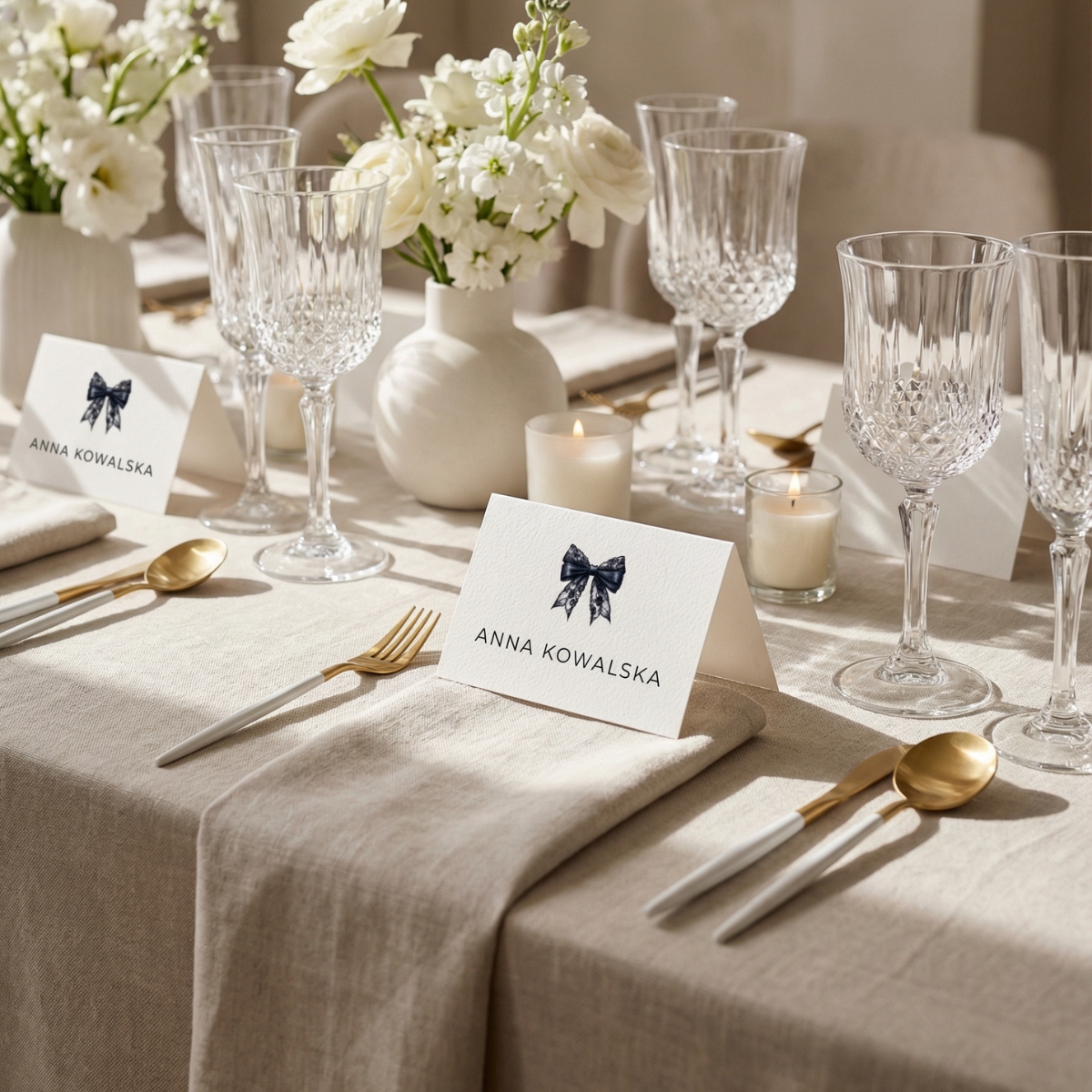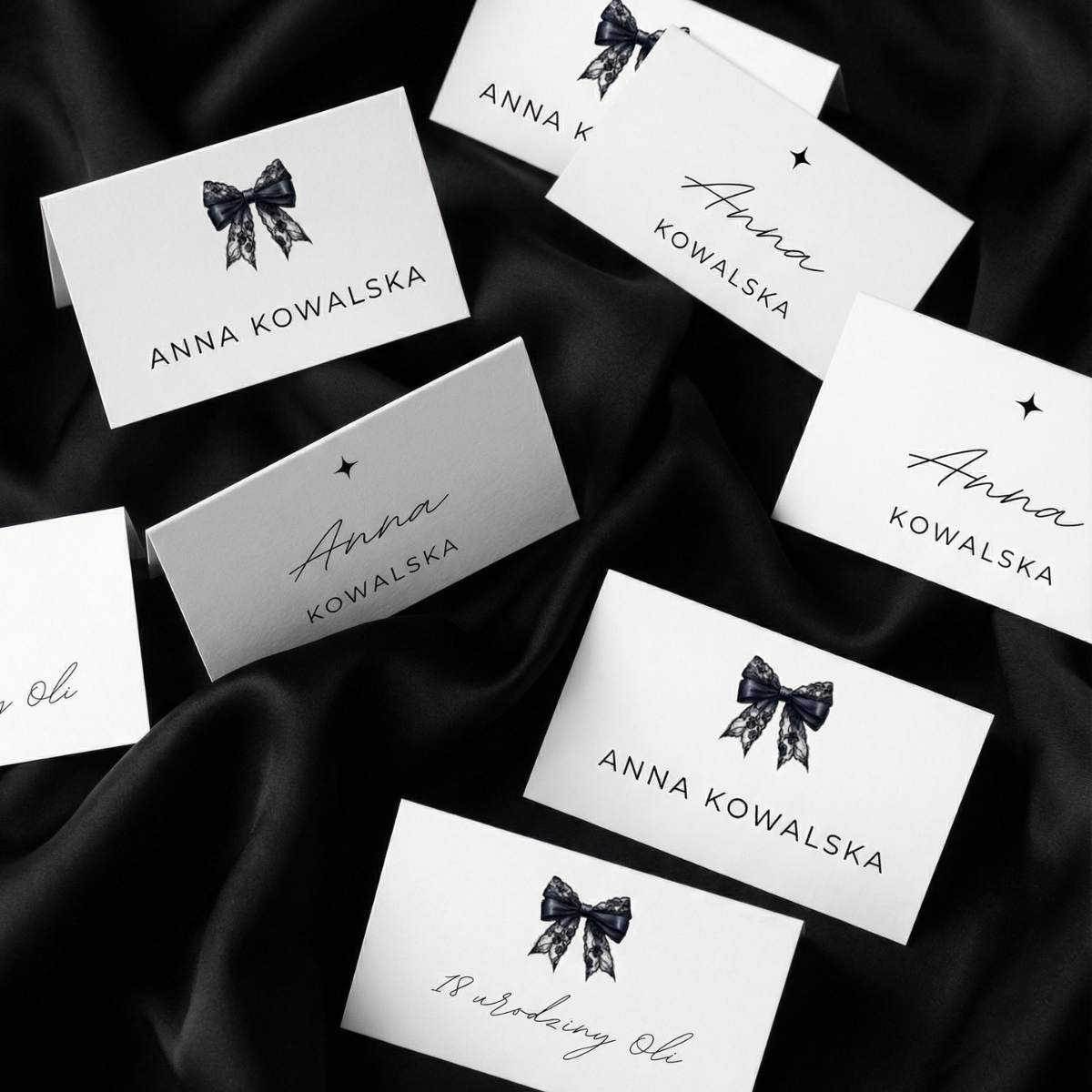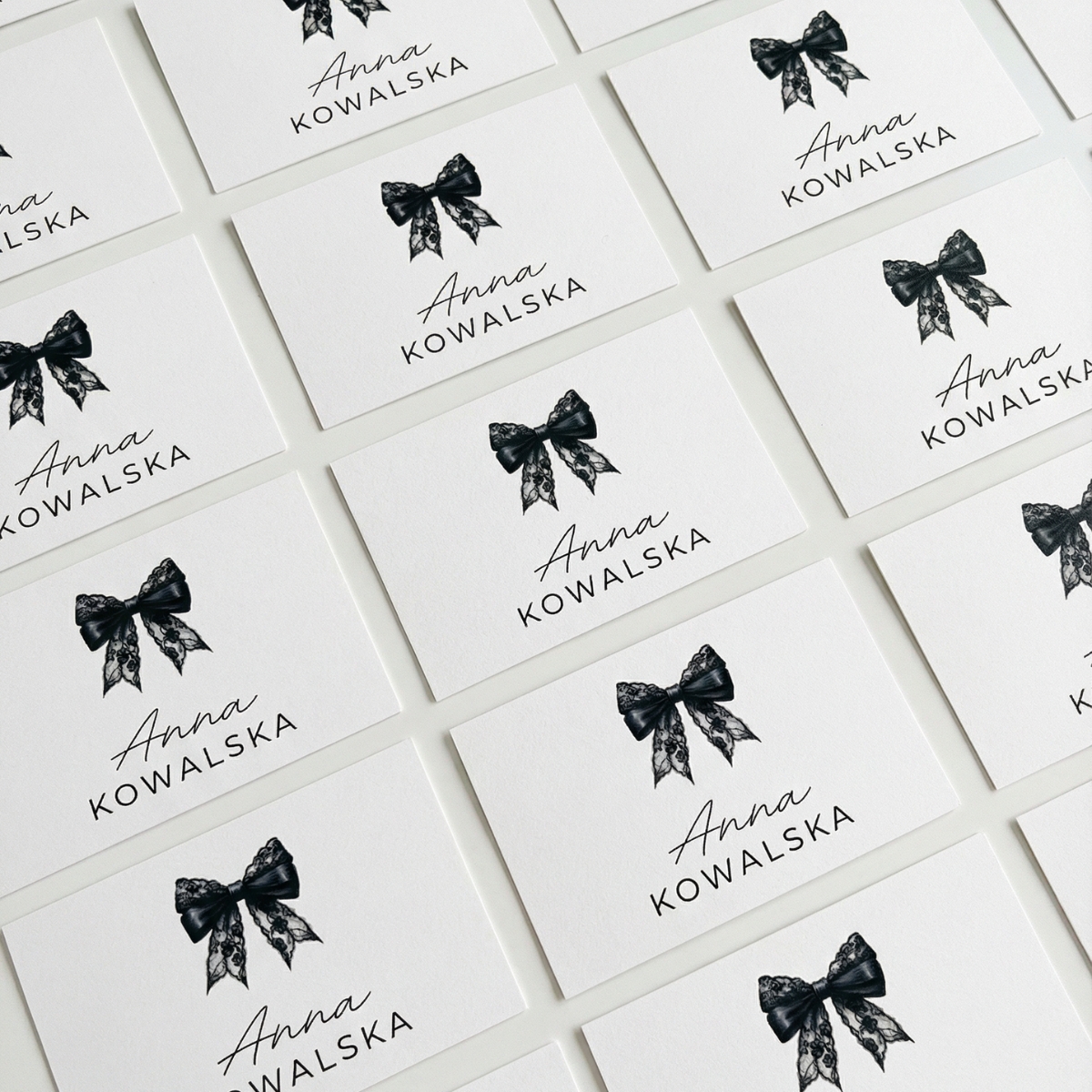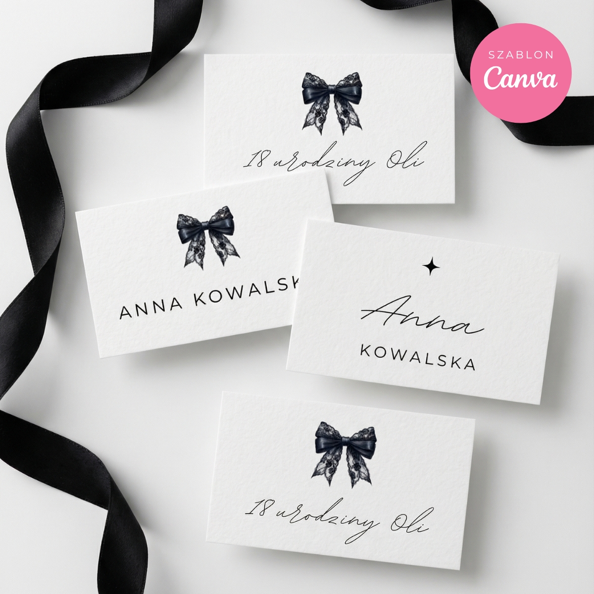 Subtelna typografia, czysta biel i ilustracja czarnej koronkowej kokardy tworzą ponadczasowy, luksusowy design, który pasuje zarówno do nowoczesnych wnętrz, jak i eleganckich aranżacji stołu.