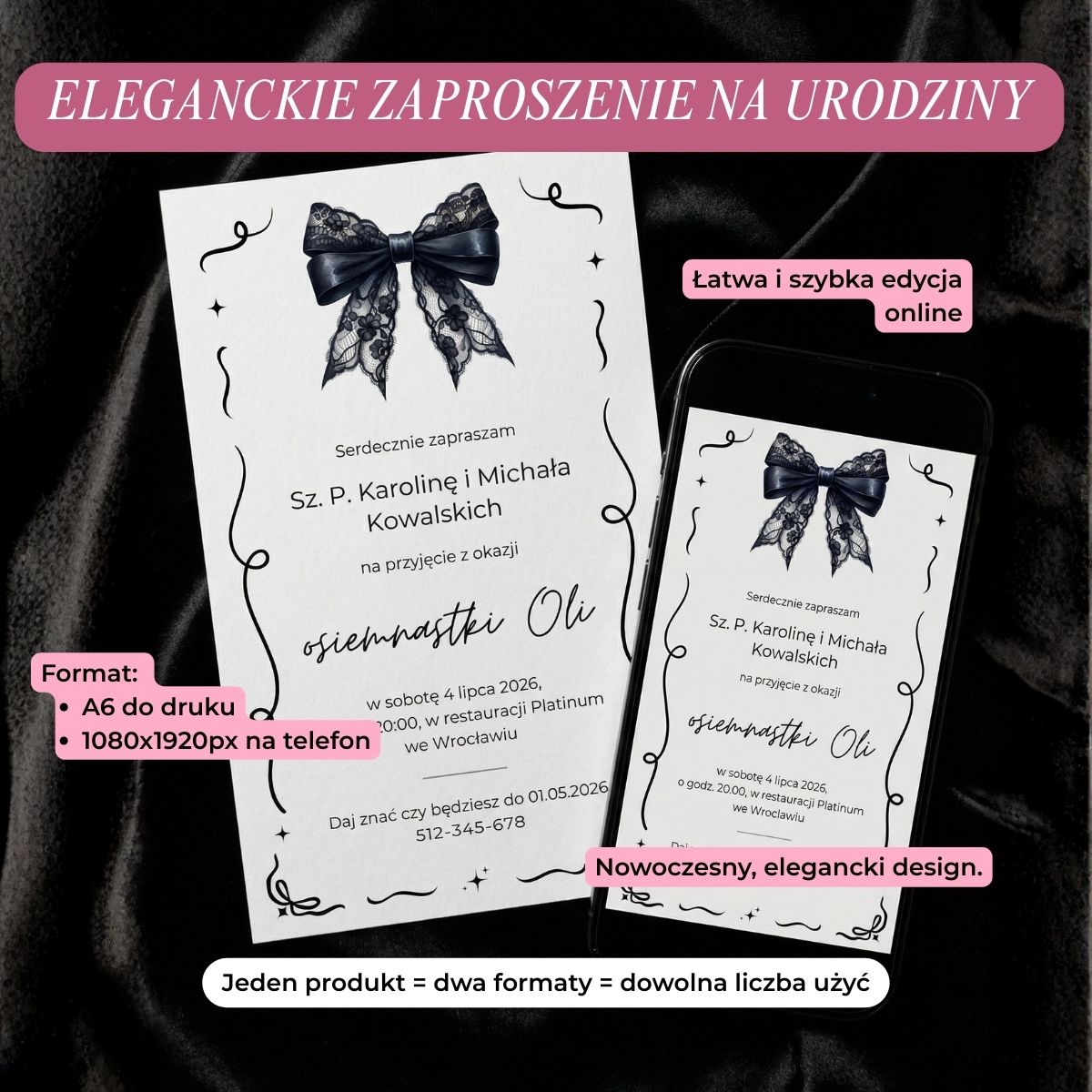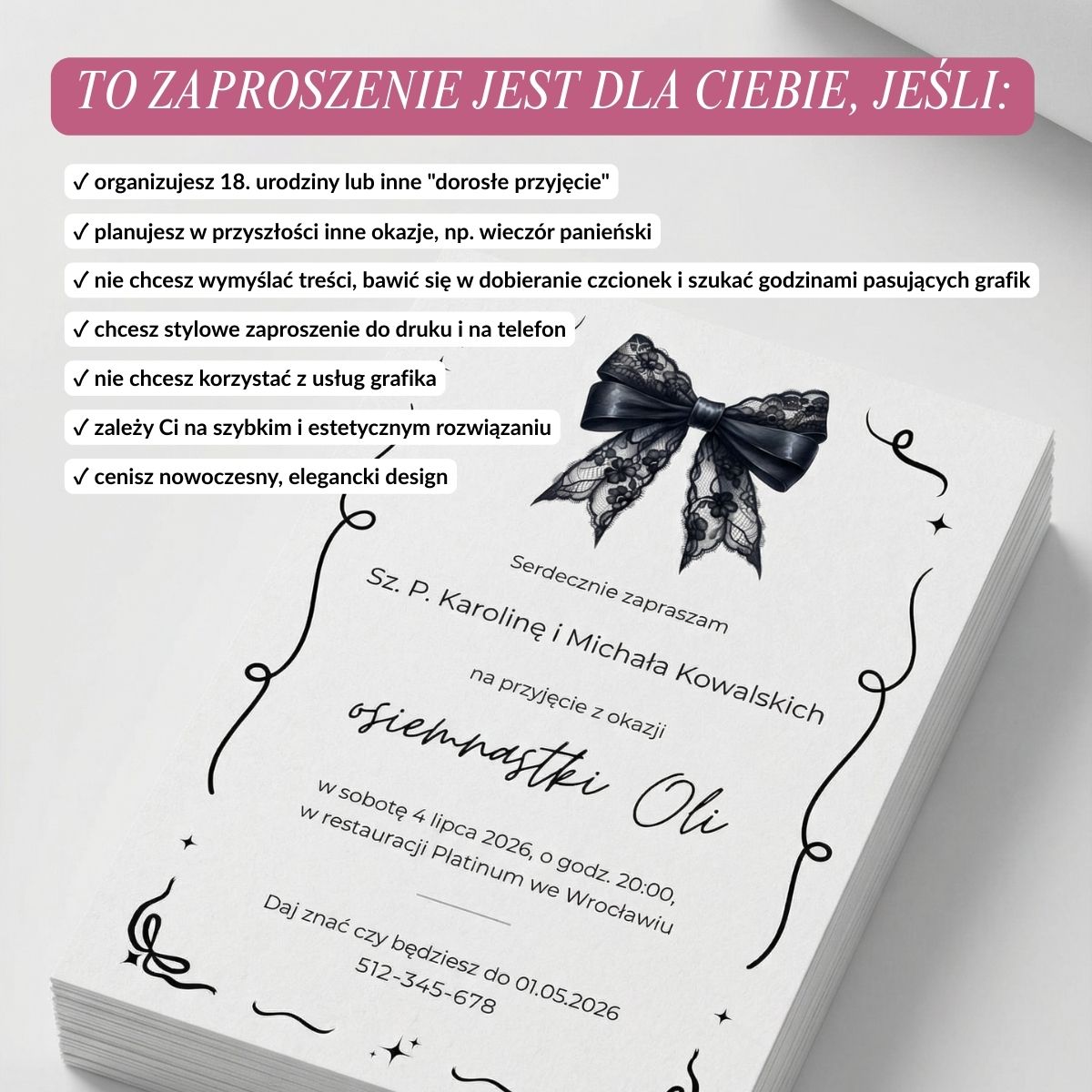 Projekt oparty na czarno-białej kolorystyce, eleganckiej typografii i dekoracyjnej czarnej kokardzie.