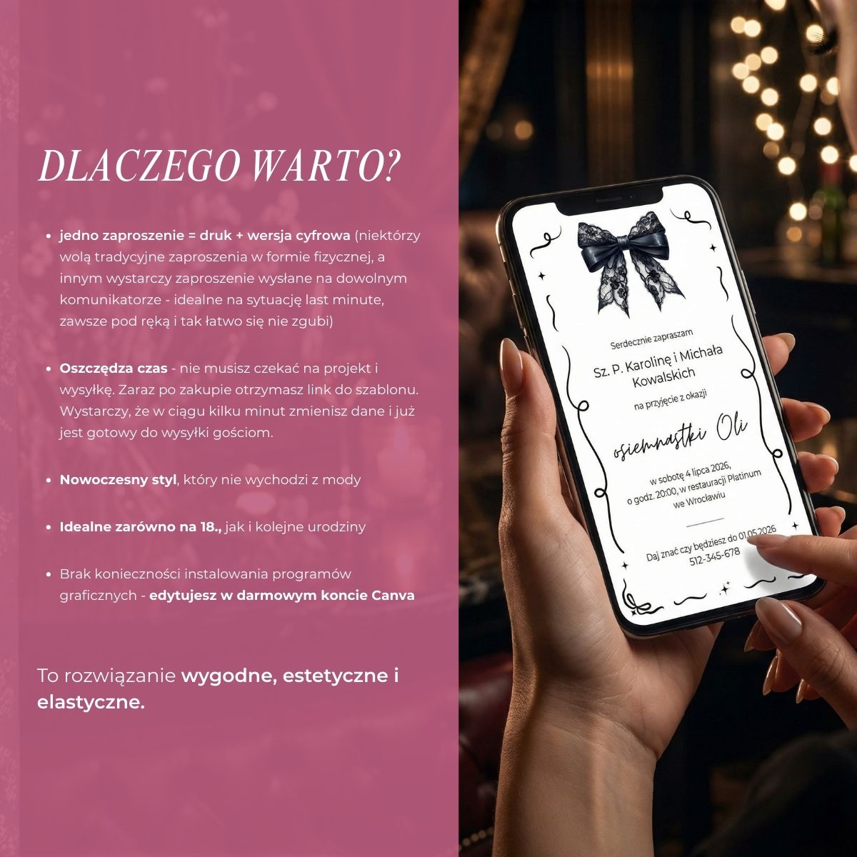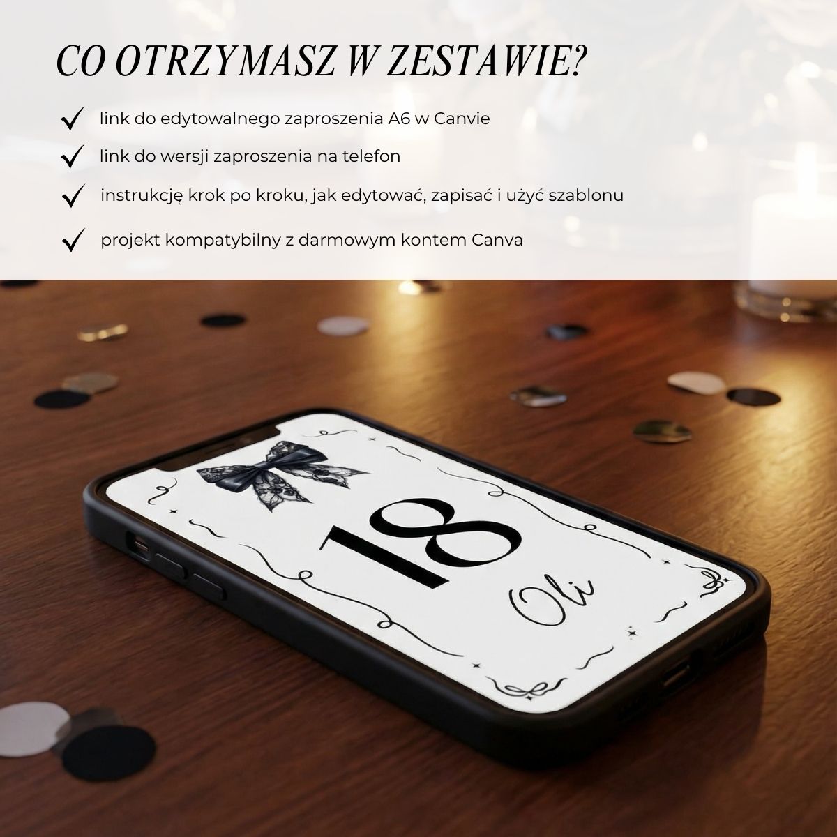 Ten nowoczesny szablon zaproszenia w Canvie w stylu modern dark glamour to idealne rozwiązanie na 18. urodziny oraz inne „dorosłe jubileusze”.