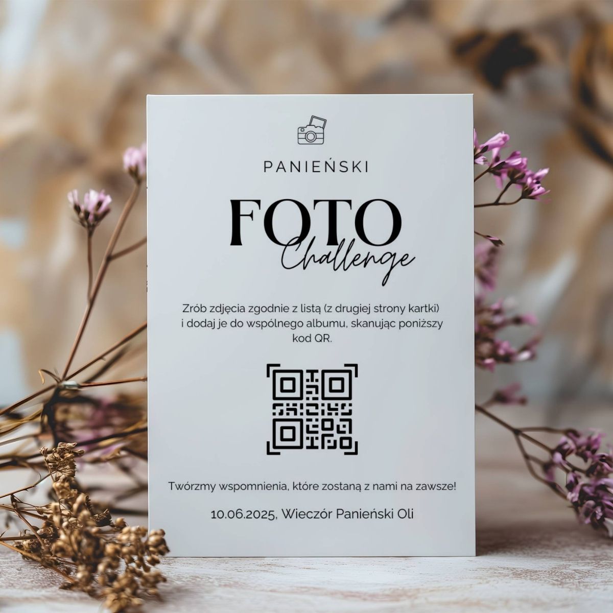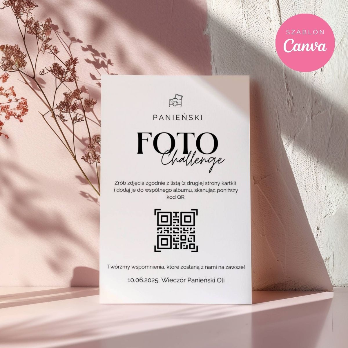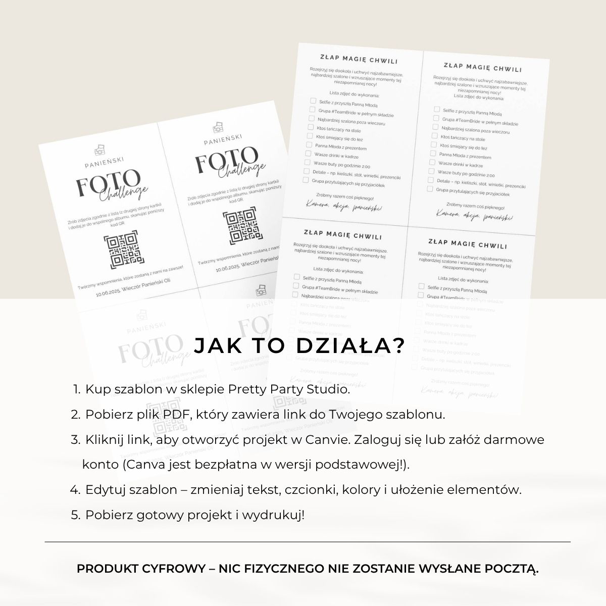 To gotowy do edycji szablon kart „Panieński FotoChallenge” w Canvie – do samodzielnej personalizacji, szybkiego druku i rozdania uczestniczkom imprezy.