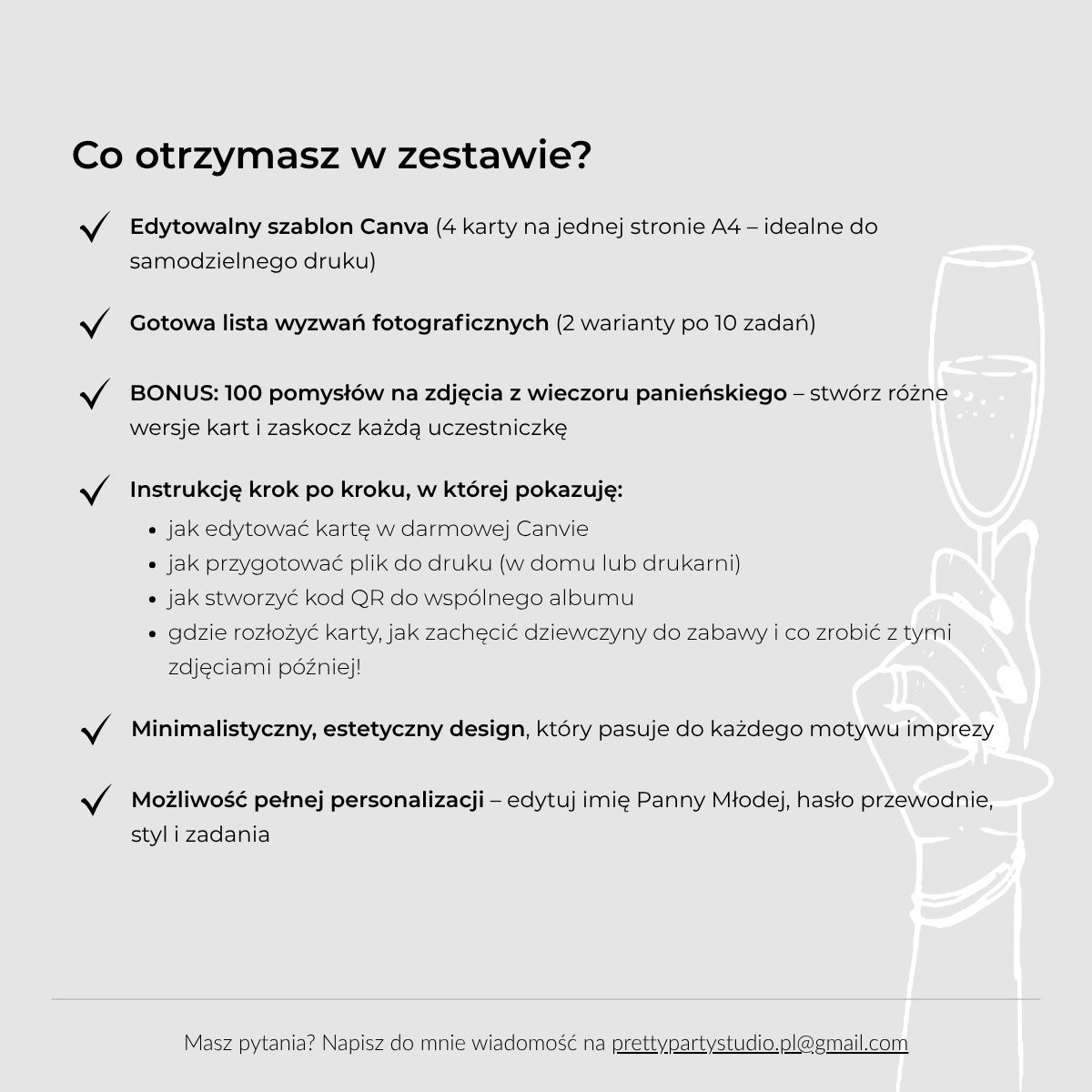 - BONUS: 100 pomysłów na zdjęcia z wieczoru panieńskiego – stwórz różne wersje kart i zaskocz każdą uczestniczkę