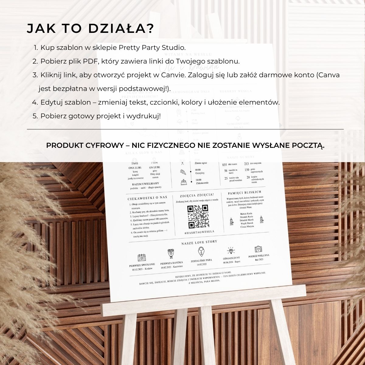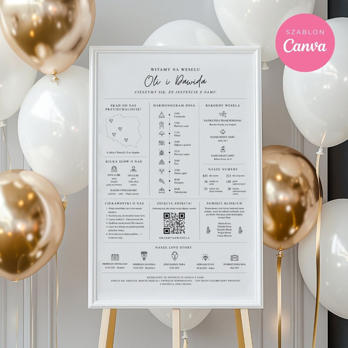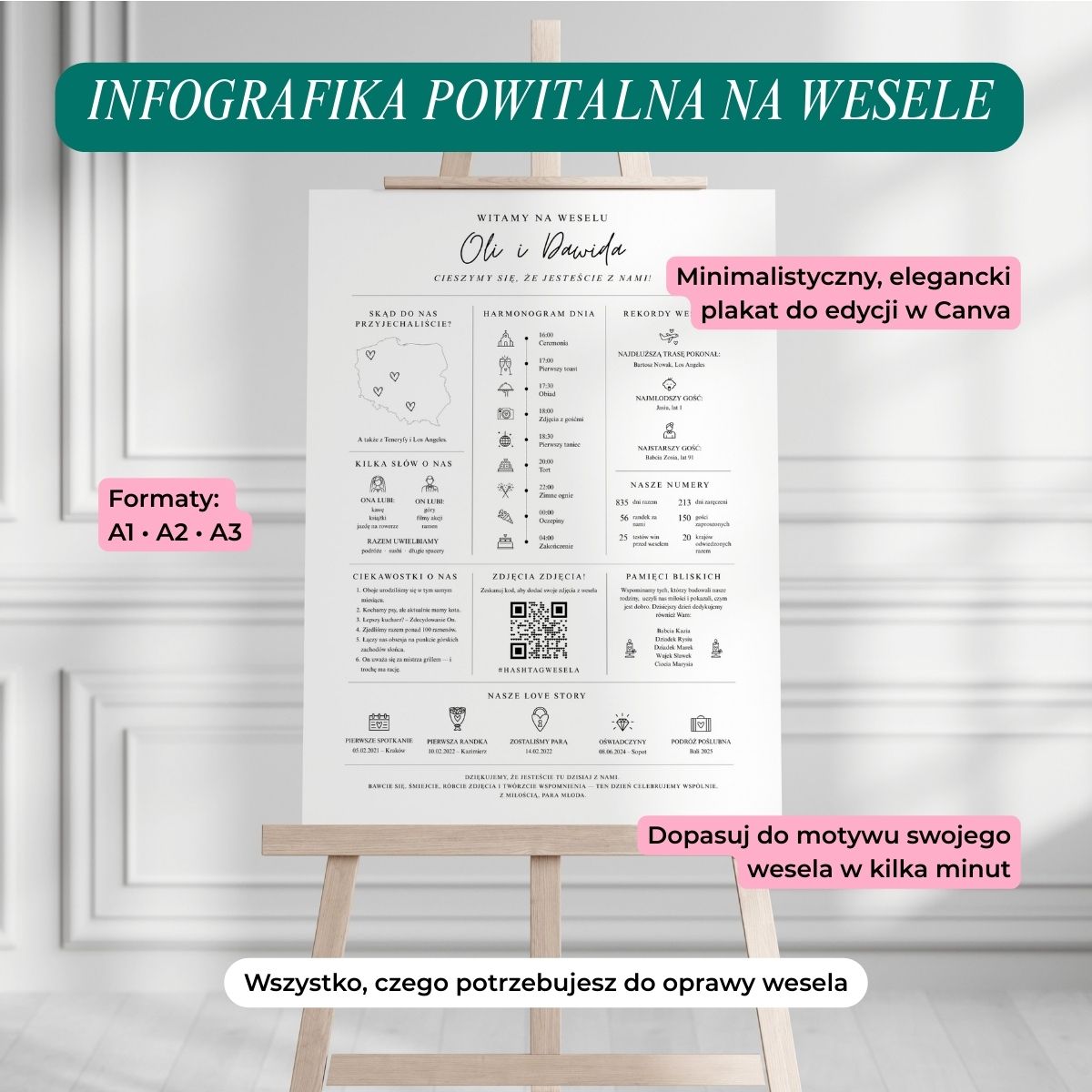 Nowoczesna i elegancka infografika powitalna na wesele — edytowalny w Canva plakat z harmonogramem dnia, mapką, ciekawostkami i historią pary. Dostępny w formatach A1, A2, A3, gotowy do druku. Idealna dekoracja wejścia, która zachwyci gości i doda spójności Twojemu weselu.