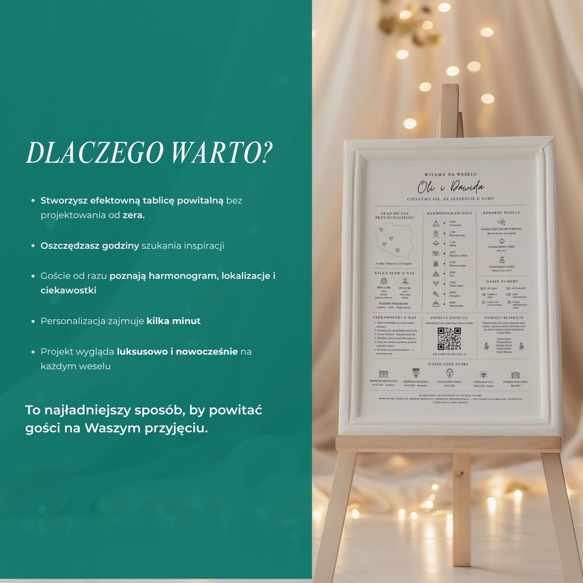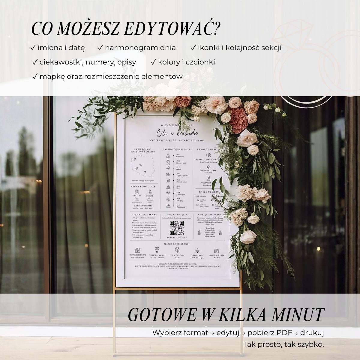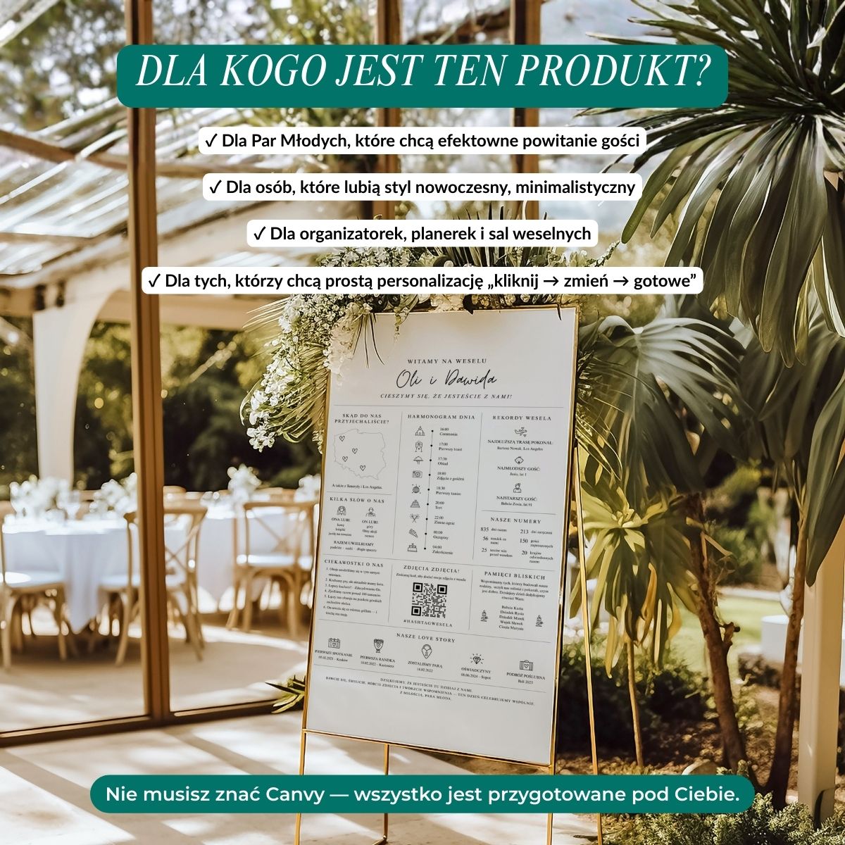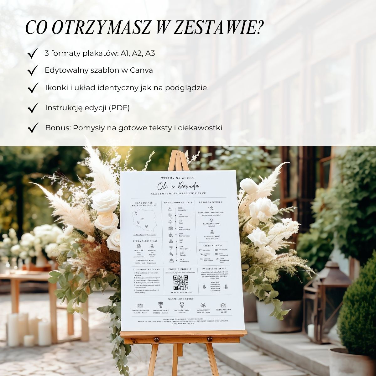 Nowoczesna i elegancka infografika powitalna na wesele — edytowalny w Canva plakat z harmonogramem dnia, mapką, ciekawostkami i historią pary. Dostępny w formatach A1, A2, A3, gotowy do druku. Idealna dekoracja wejścia, która zachwyci gości i doda spójności Twojemu weselu.