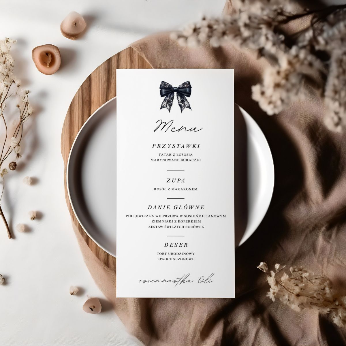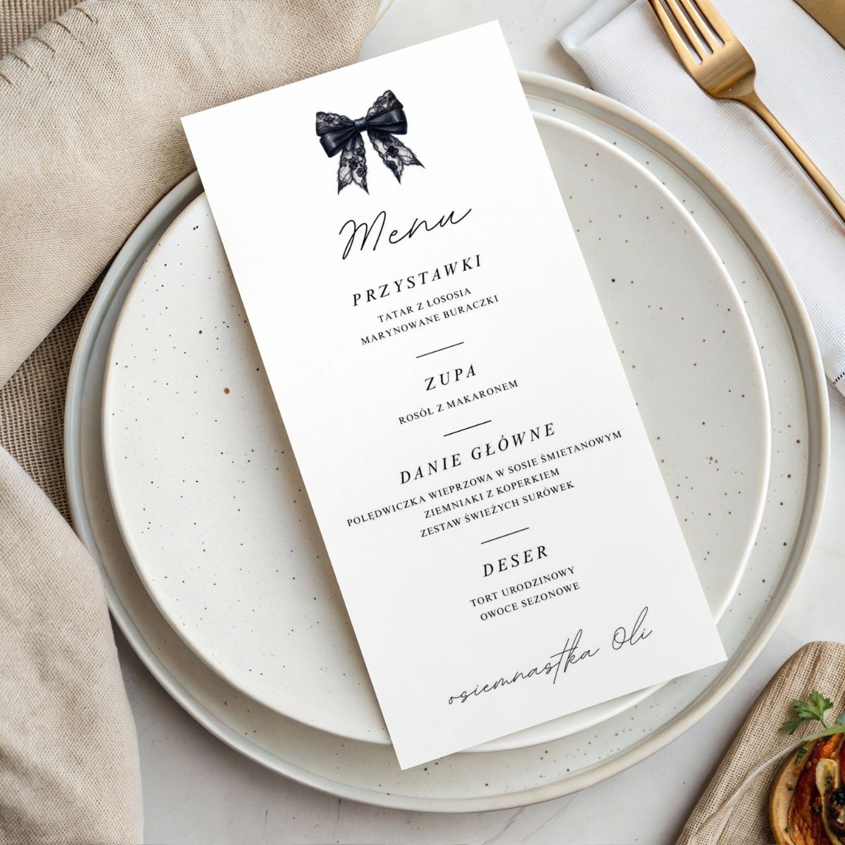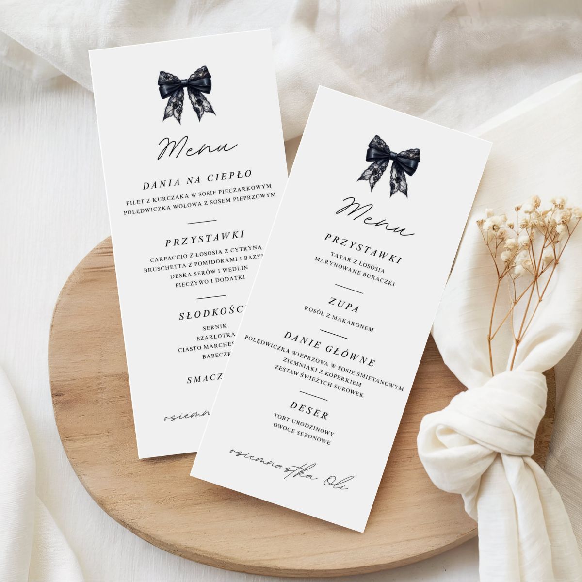 Minimalistyczny design z czarną kokardą inspirowany modą editorialową, czarnym papierem i subtelnymi detalami sprawia, że menu idealnie pasuje zarówno do osiemnastki, jak i do kolacji urodzinowej, domówki, garden party czy przyszłych uroczystości.