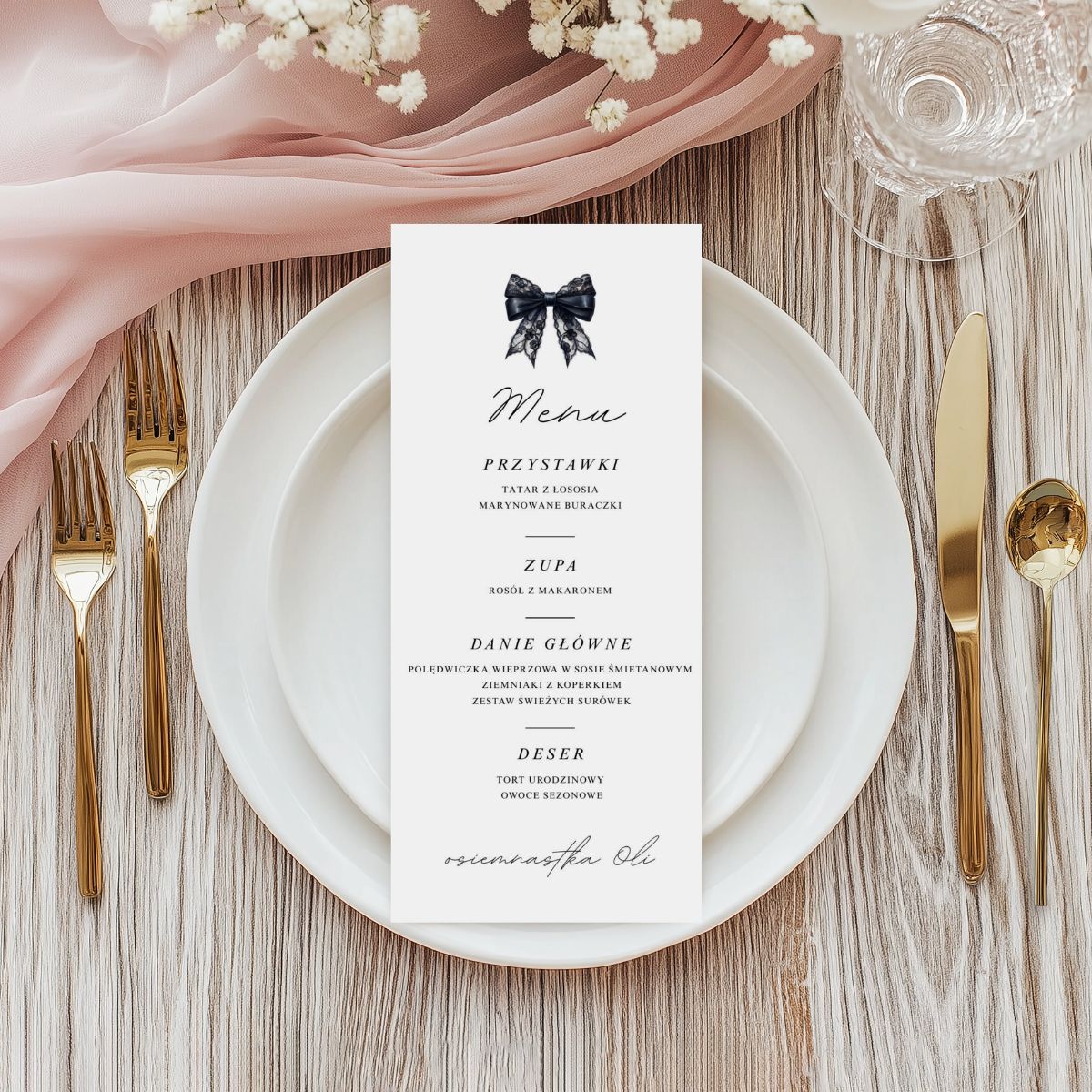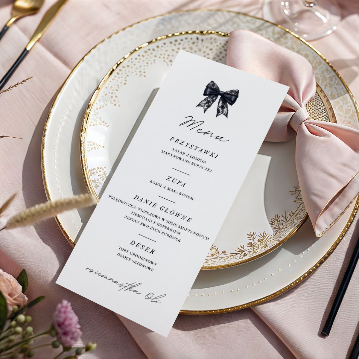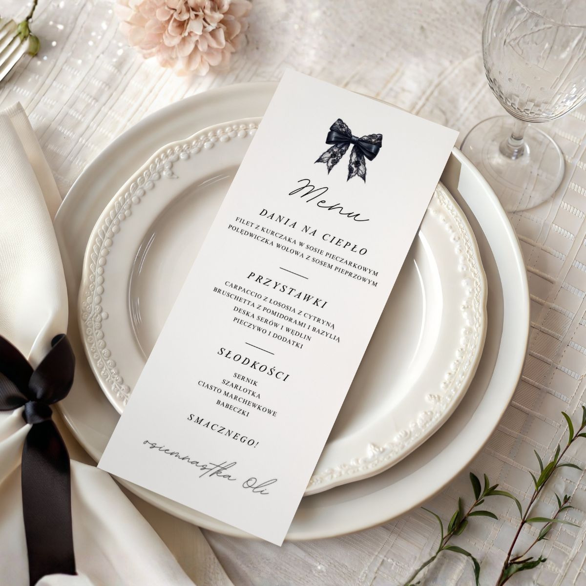 Minimalistyczny design z czarną kokardą inspirowany modą editorialową, czarnym papierem i subtelnymi detalami sprawia, że menu idealnie pasuje zarówno do osiemnastki, jak i do kolacji urodzinowej, domówki, garden party czy przyszłych uroczystości.