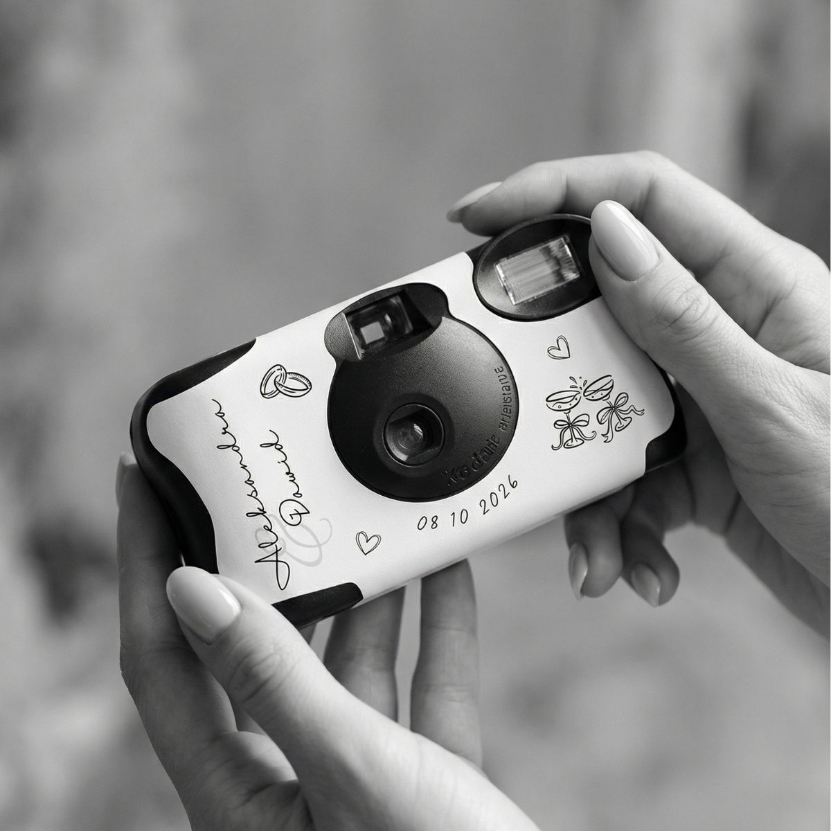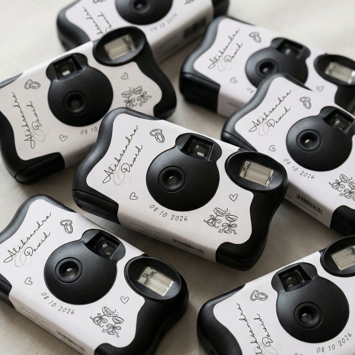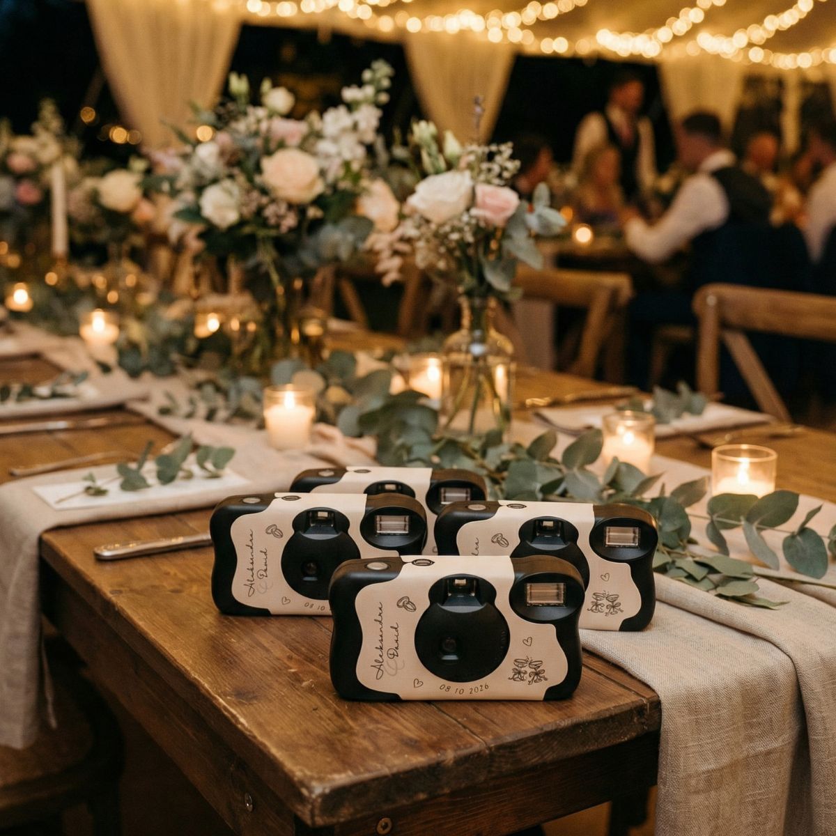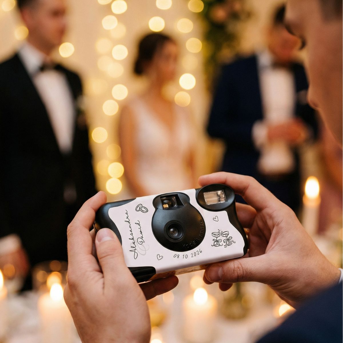Wyobraź sobie stoły weselne, na których leżą aparaty z Waszymi imionami i datą ślubu – gotowe, by uchwycić spontaniczne, prawdziwe momenty 📸