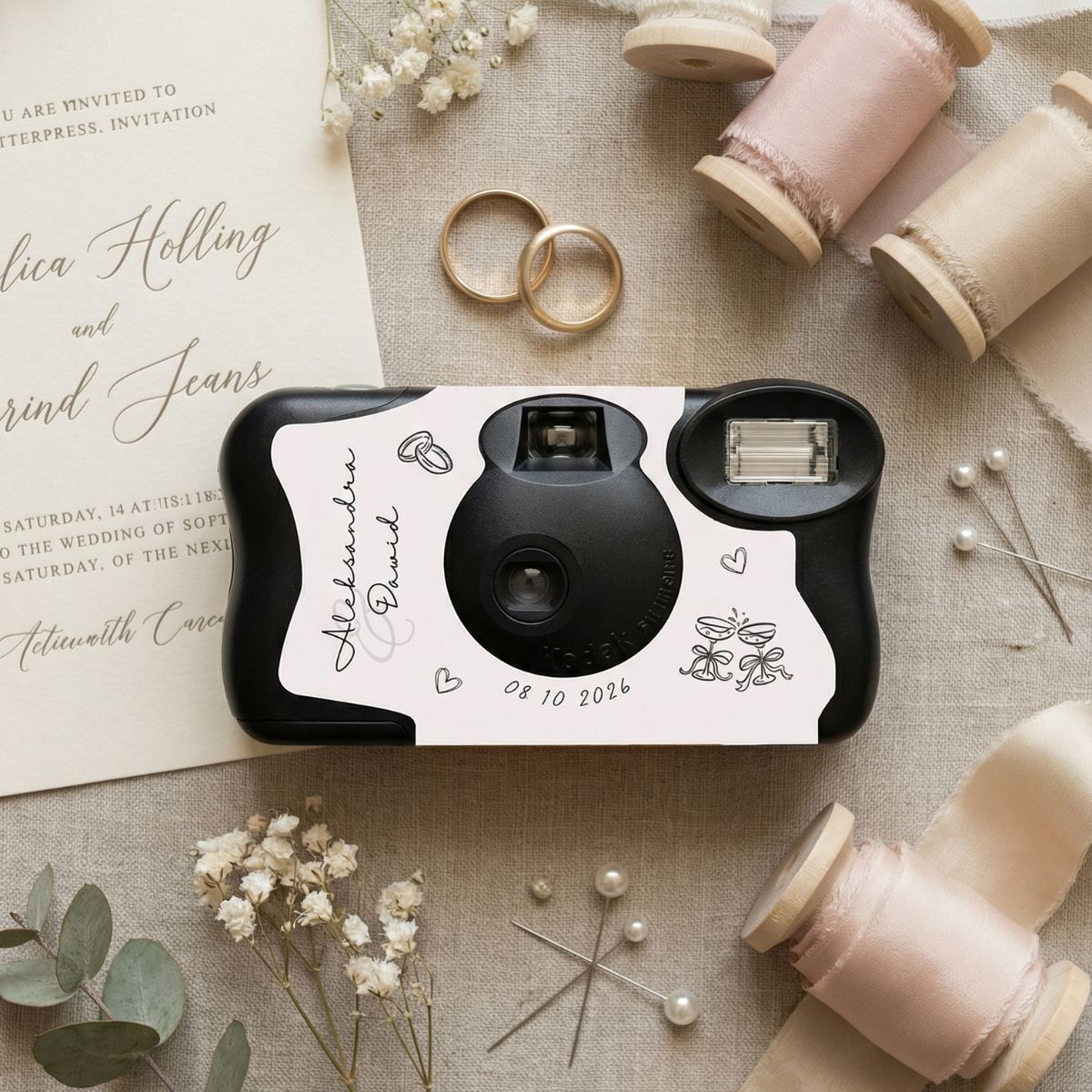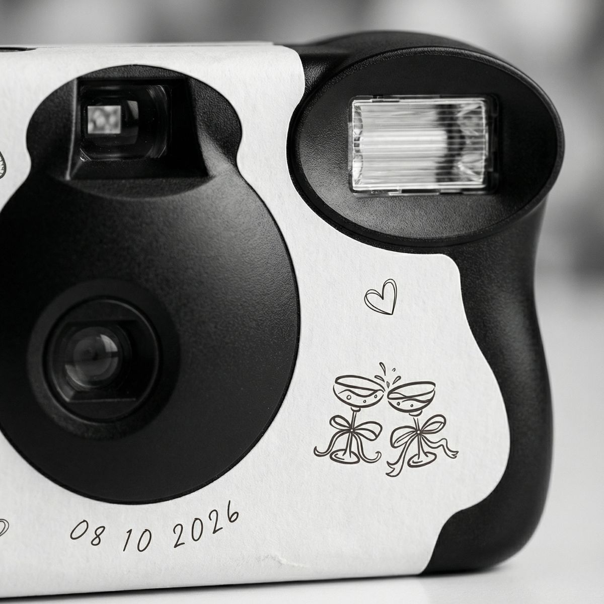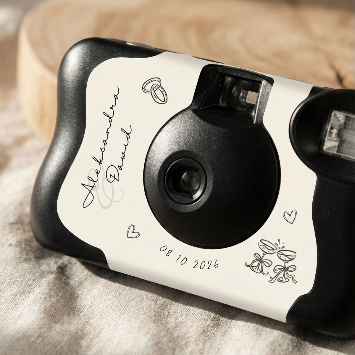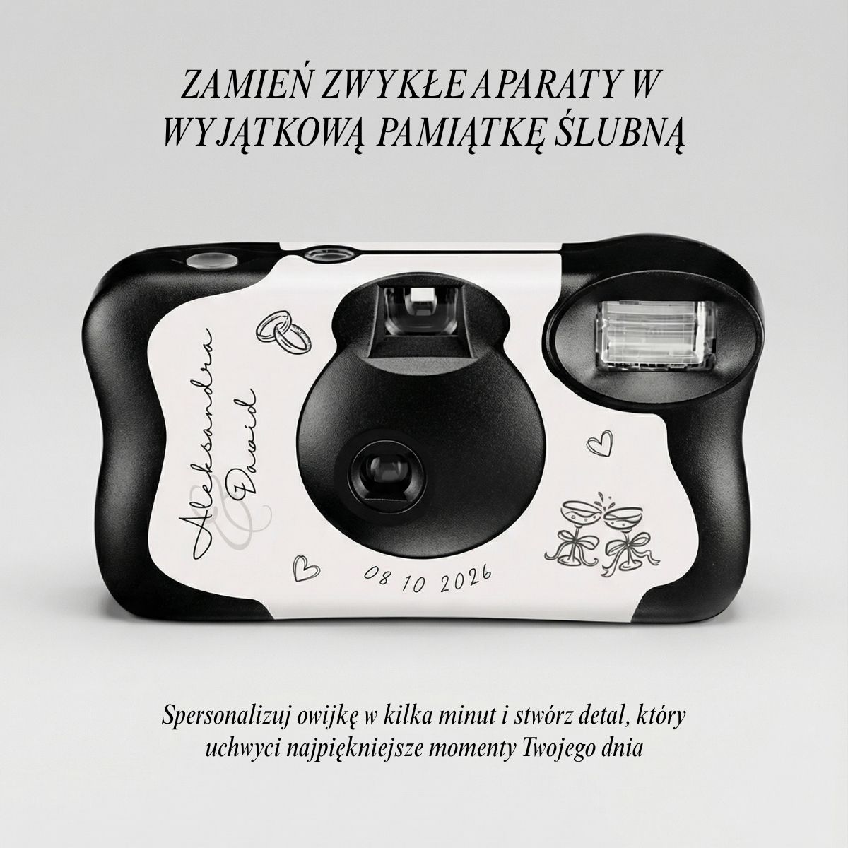 Wyobraź sobie stoły weselne, na których leżą aparaty z Waszymi imionami i datą ślubu – gotowe, by uchwycić spontaniczne, prawdziwe momenty 📸