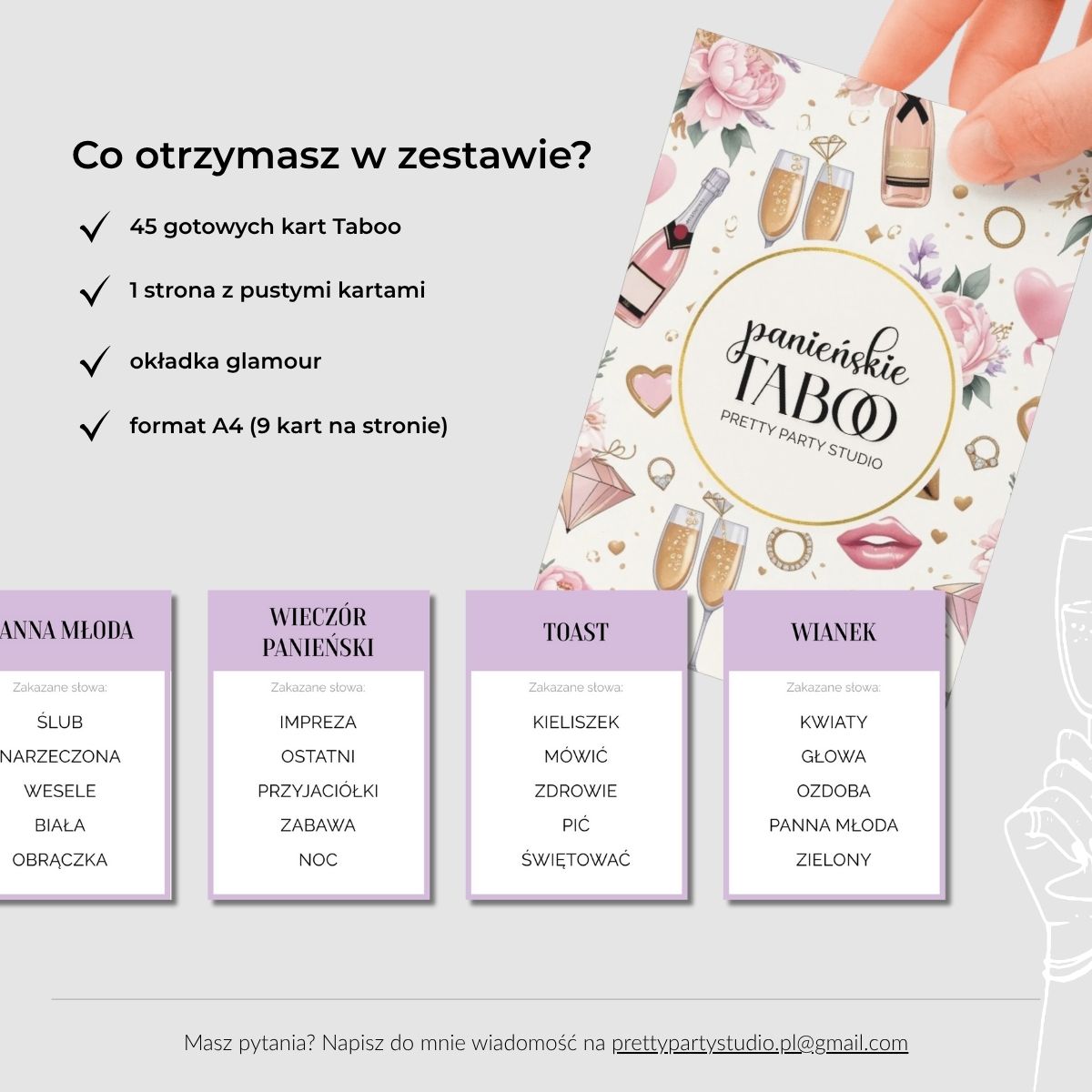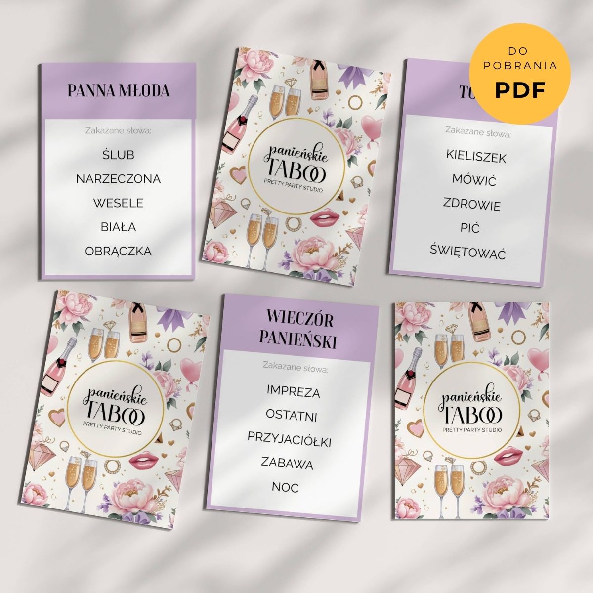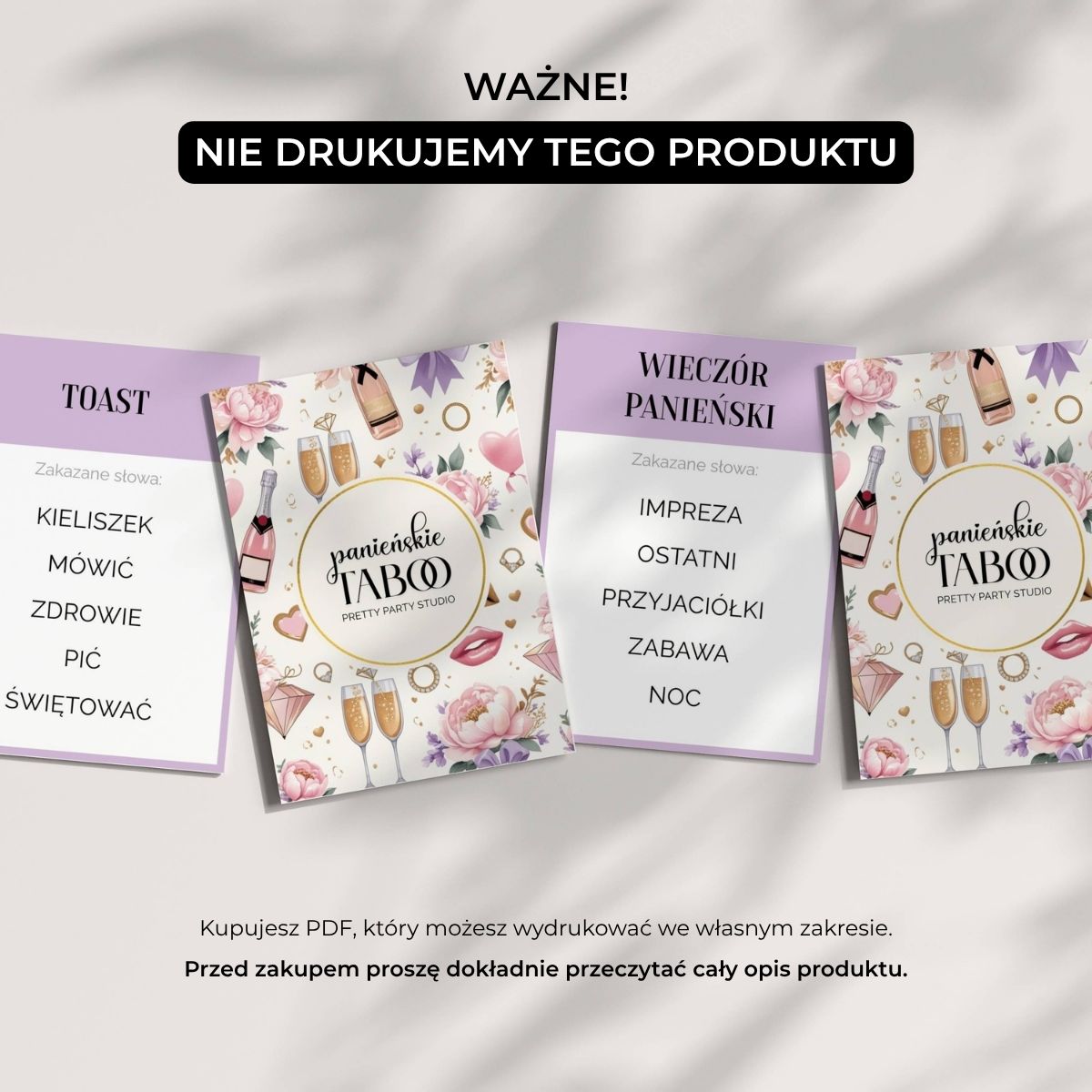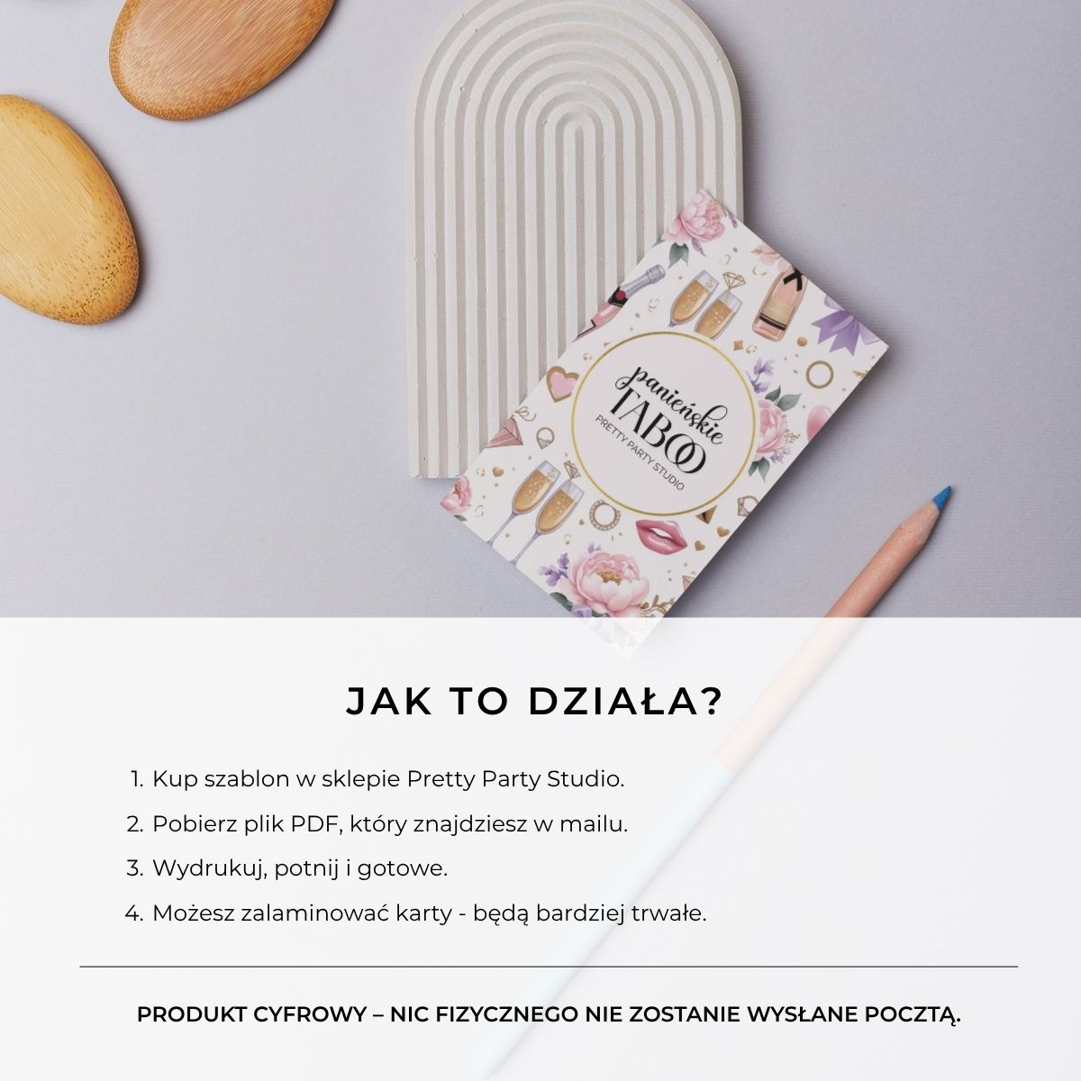 Stwórz niezapomnianą atmosferę podczas wieczoru panieńskiego dzięki zabawie Taboo w pięknej, kobiecej oprawie! To produkt cyfrowy do samodzielnego druku – idealny, jeśli szukasz gotowej, estetycznej gry, która rozkręci każdą imprezę.