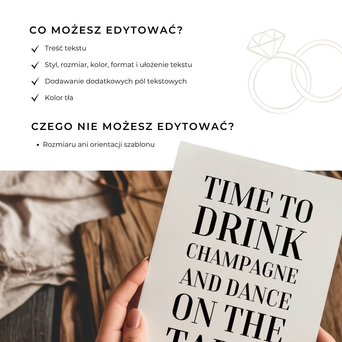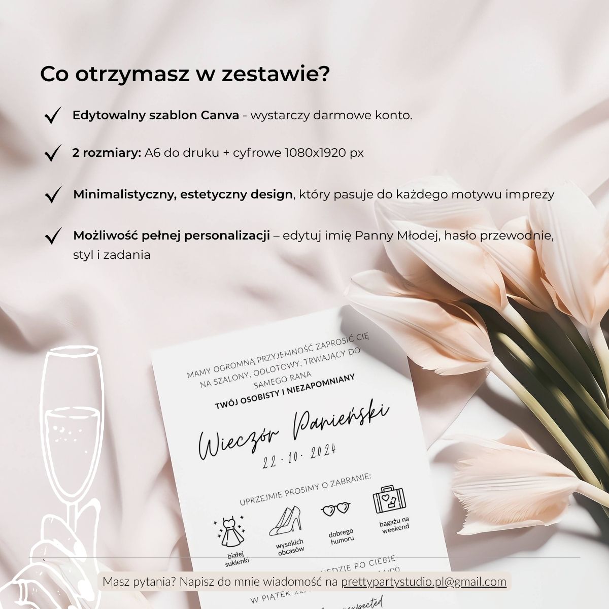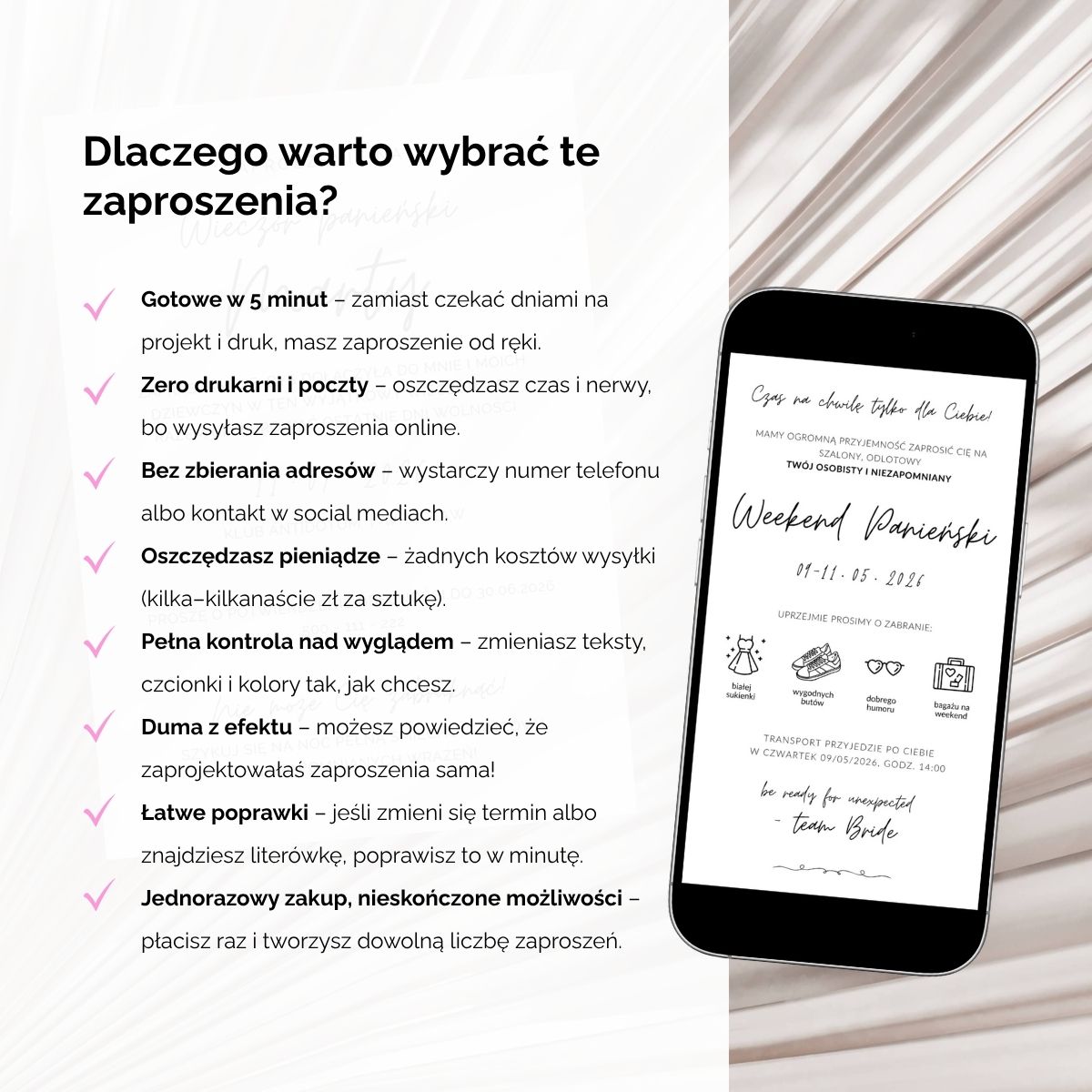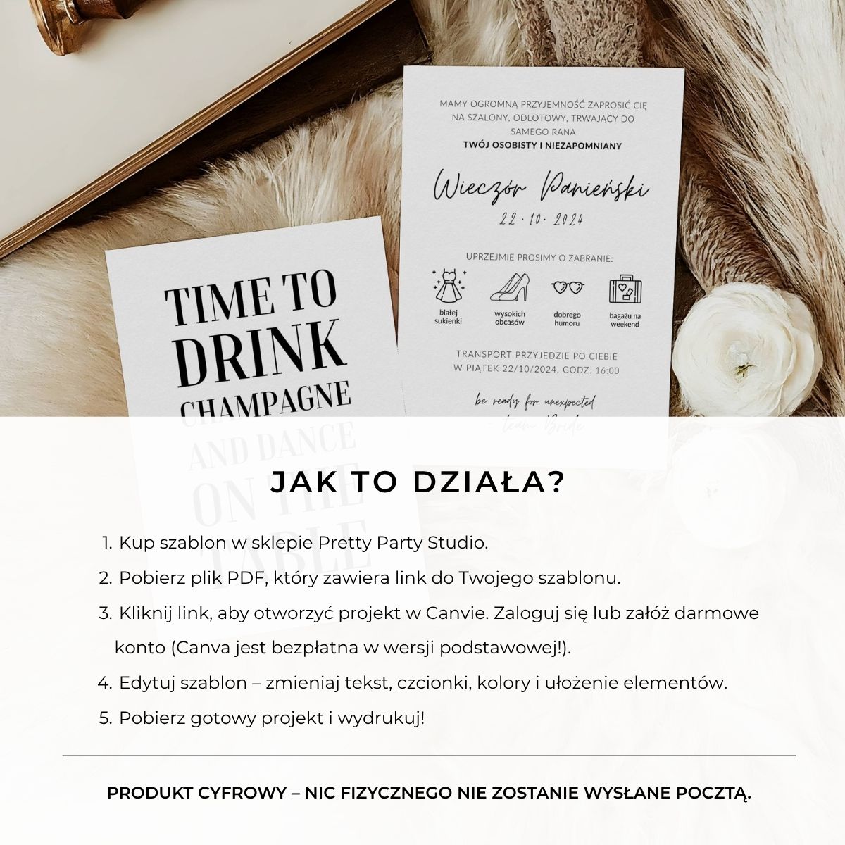 • Pełna personalizacja: zmień imię Panny Młodej, daty, styl imprezy i treści